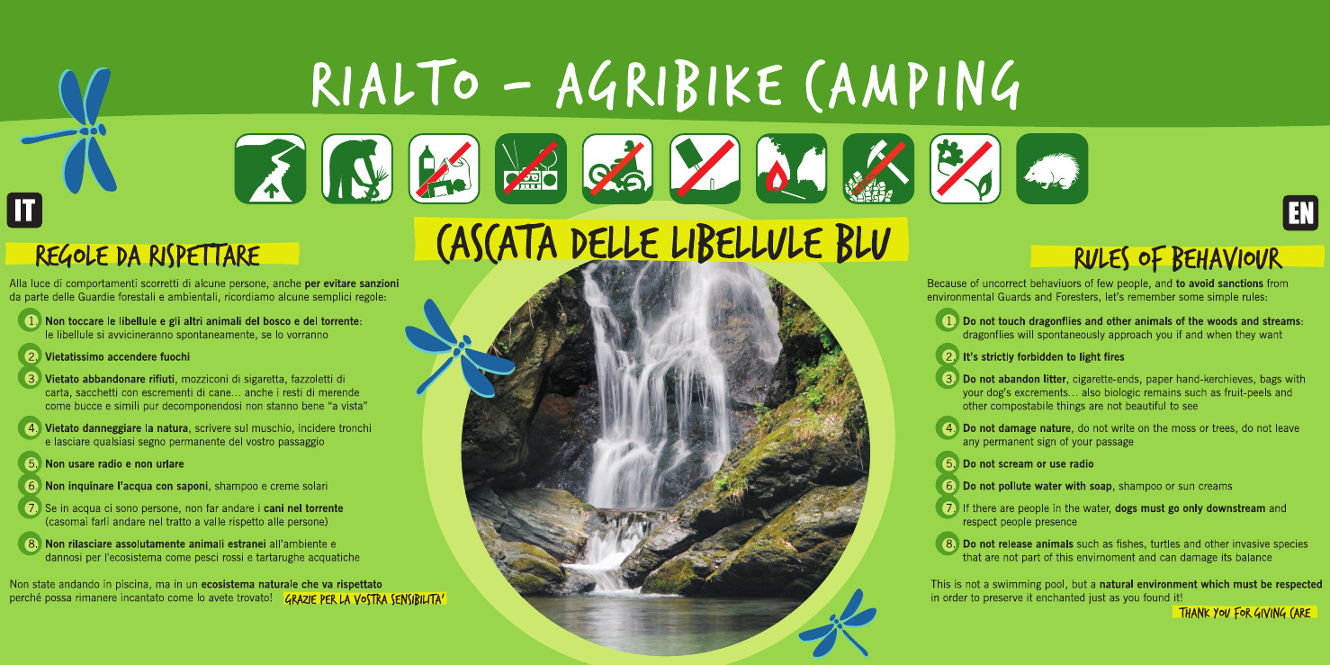 In Comune di Rialto esiste una grande area Wilderness, denominata "Bric Gettina", alla quale la Cascata delle Libellule Blu è direttamente collegata. Si tratta di un accordo di tutela volontaria, siglato con l'Associazione Italiana Wilderness, per mantenere il sito intatto.